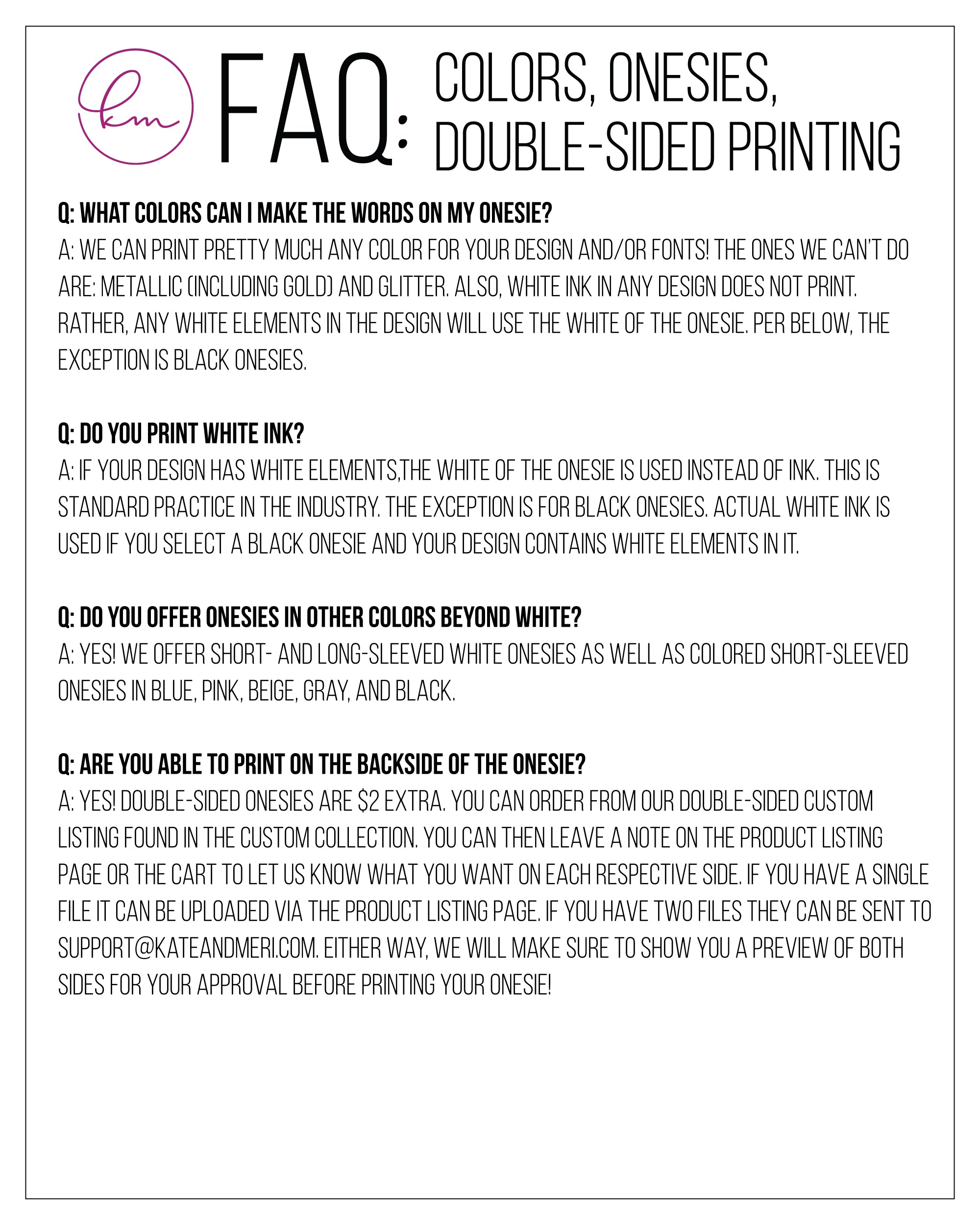 All of our onesies are printed with love on a world-class direct-to-garment printer that offers a far better print quality than vinyl heat transfer. The eco-friendly inks used are kid and pet safe and have been rated with the highest rating for the number of times they can be rewashed before fading occurs. Post-printing we cure the ink with a commercial quality heat press to ensure your printed onesie does not crack. We are 100% confident you’ll love the gorgeous and long-lasting onesie that you will get. Please note, white ink in any design does not print. Rather, any white elements in the design will use the white of the onesie.