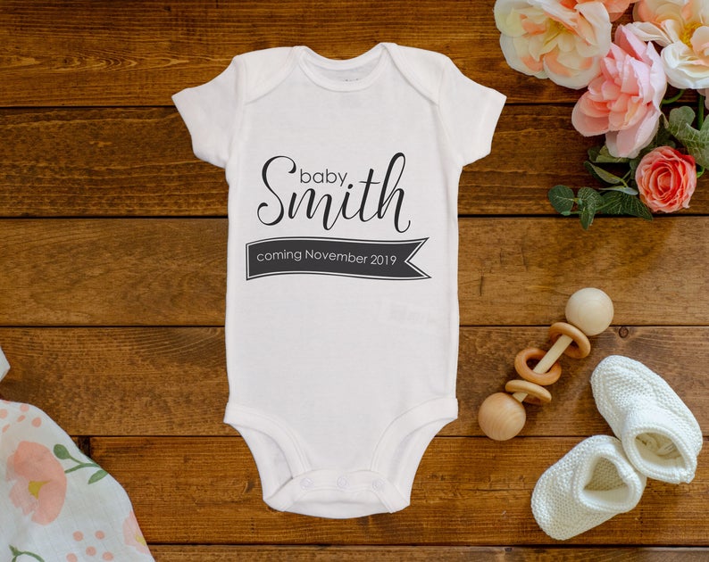 Announce your pregnancy in style with this announcement onesie ("Baby Name + ETA Month"). Select custom order and let us know the name and month you're due. Change fonts and colors too if you want. All at no extra charge!Read more below on details about why to buy from us, Carter’s and Gerber Onesies®, sizing details, care instructions, production (1-2 business days!) and shipping time, our printing process, and more. Listing is for the onesie only. Other items pictured are for visual aesthetics only. Pictured Onesie is a 3-6m size. Please see the sizing chart below for proper sizing decisions.Need a custom order? Contact us and we’d be happy to help. Custom orders are done at no additional charge.